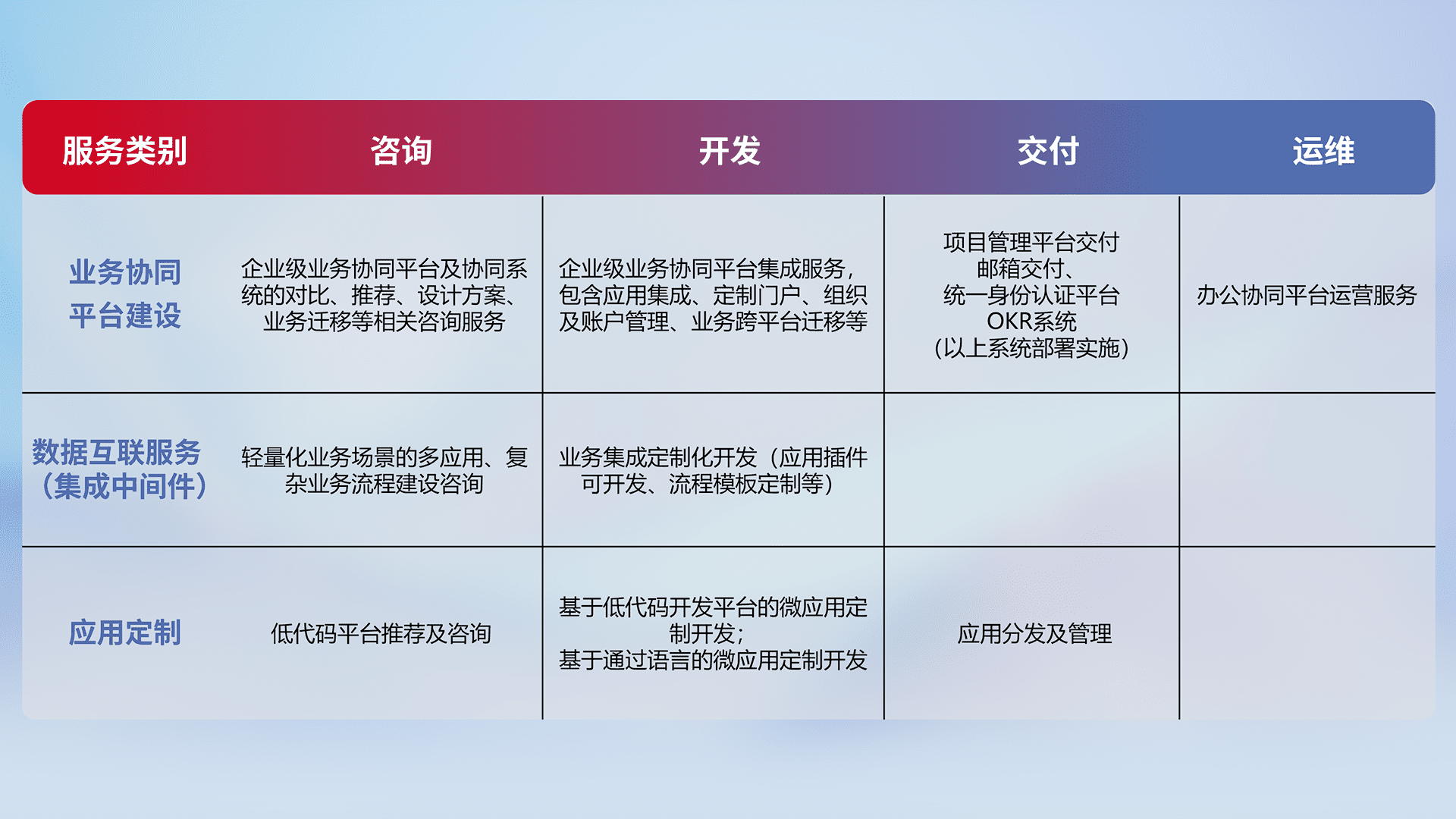针对钉钉、、、企微、、IDaas等平台级产品提供产品的规划、、方案、、、、交付、、、定制化开发等服务,,实现如统一协同办公、、智能客户服务、、混合会议管理、、、、智能数据查询、、、等业务场景,,,,实现数字化转型。。。。