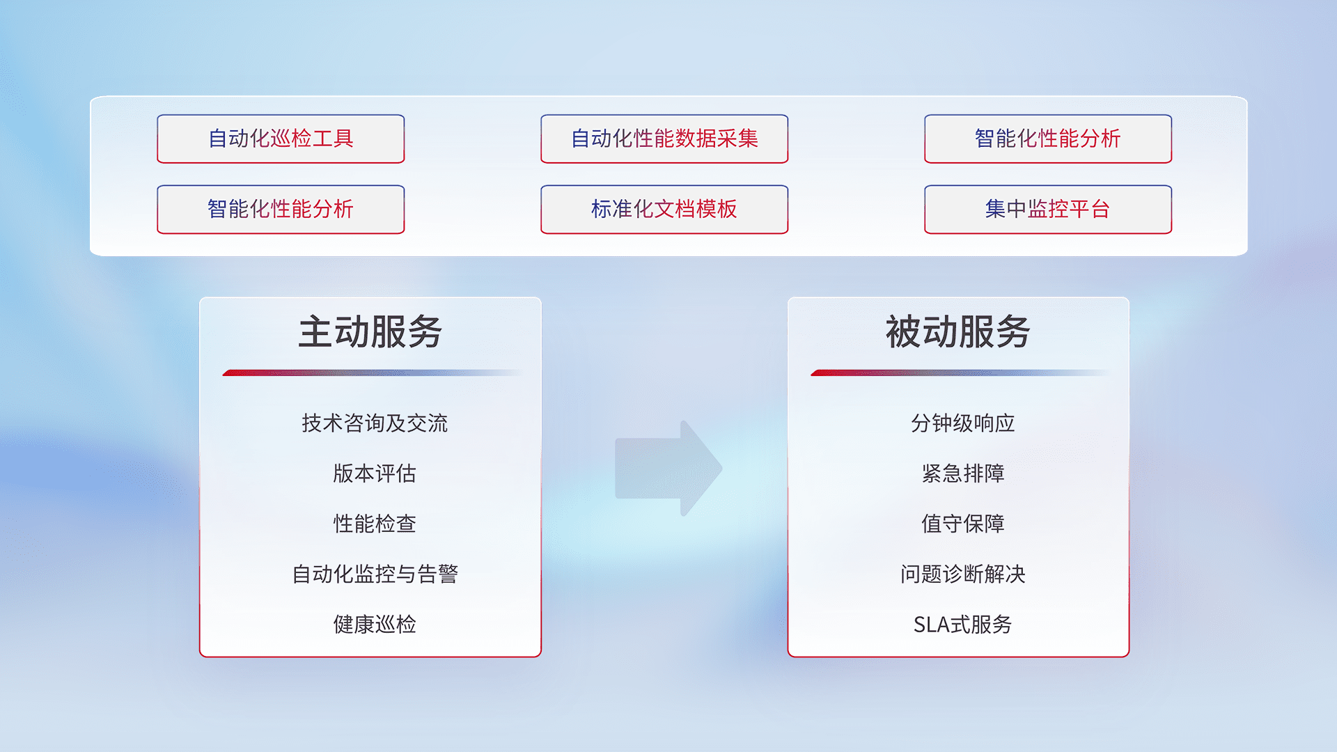 智能化工具和标准化文档,,,保障服务质量,,,提供主动服务(包含技术咨询、、版本评估、、性能检查、、、自动化监控与告警、、、健康巡检)和被动服务包含(分钟级响应、、、紧急排障、、值守保障、、、、问题诊断解决、、、SLA服务)。。
